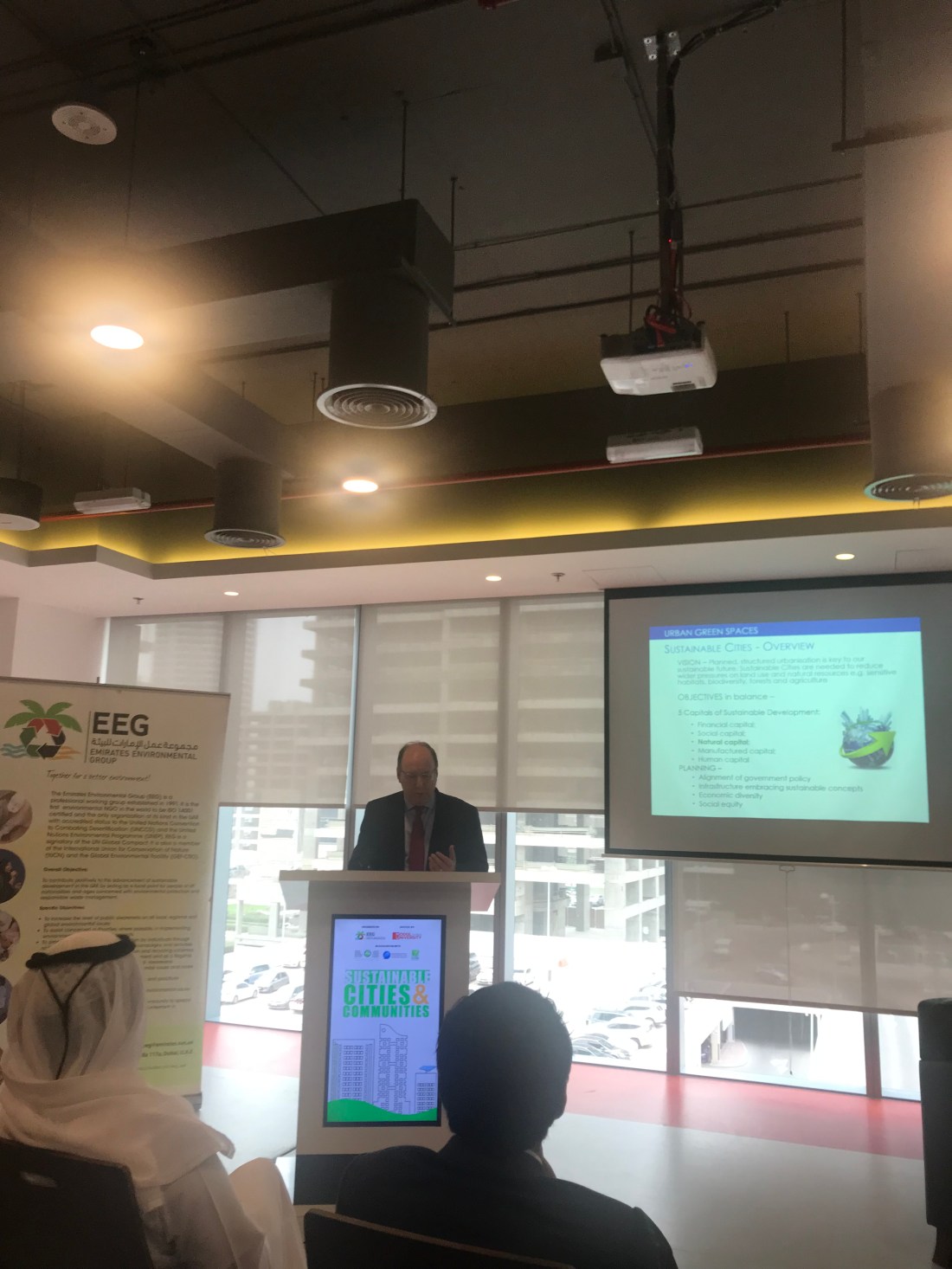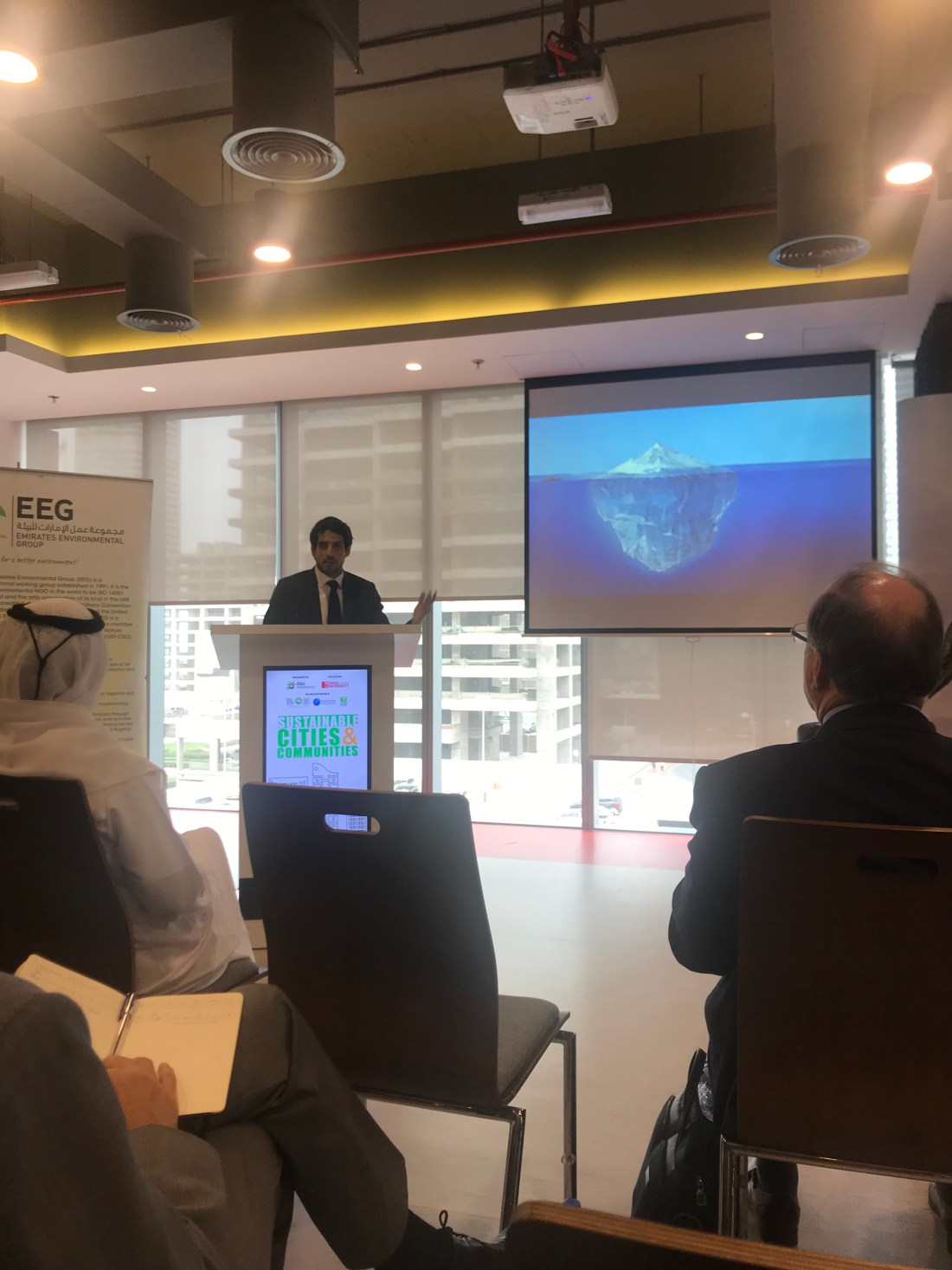 It was a dusty morning in downtown Dubai at the offshore campus of MODUL University at JLT1, a plush office block where the Emirates Environmental Group, UAE ‘s premier Environmental Non Profit had organised an intellectually invigorating morning of ideas on the Sustainable Cities and Communities theme. The line up of speakers where the Who’s Who of Dubai’s Sustainability Community; Kenneth Wade of 5 Capitals, Saeed Al Abbar, of AESG, Huda Shaka of Arup and Pradip of Ettihad ESCO.