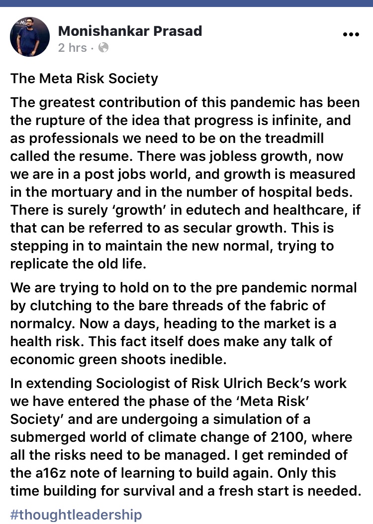 The greatest contribution of this pandemic has been the rupture of the idea that progress is infinite, and as professionals we need to be on the treadmill called the resume. There was jobless growth, now we are in a post jobs world, and growth is measured in the mortuary and in the number of hospital beds. There is surely ‘growth’ in edutech and healthcare, if that can be referred to as secular growth. This is stepping in to maintain the new normal, trying to replicate the old life.