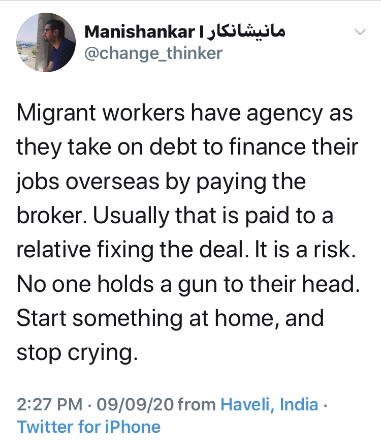 I think this is important to put out in the light of what i see as migrant crisis porn. As a second gen migrant with active work and family links to both the Gulf and Singapore i can feel the pain of a genuine migrant in trouble. I have not been paid my former employers whom i have taken to court and have got my pending salaries. I have absolutely no hard feelings for them, rather a sense of gratitude as salaries is not the only element we earn at work. These are skills, ideas and life long networks too. I work with non profits and write on migration issues regularly. In the pandemic i have pitch in to many civil society micro initiatives. As a migration researcher, i speak multiple languages including Bangla and see a lot of unnecessary banter of migrants playing the victim card. Singapore has done the maximum in this crisis as have other Gulf countries even more than passport countries, ask anyone from India or Nepal. There needs to be gratitude. If the elevator in your dorm is not working, complain to the dorm management rather than defame the country.