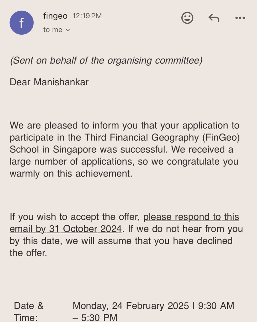 So glad to have made it to the Third Financial Geography (FinGeo) Workshop at the National University of Singapore next year! Splendid to be joining this group of early career scholars.
